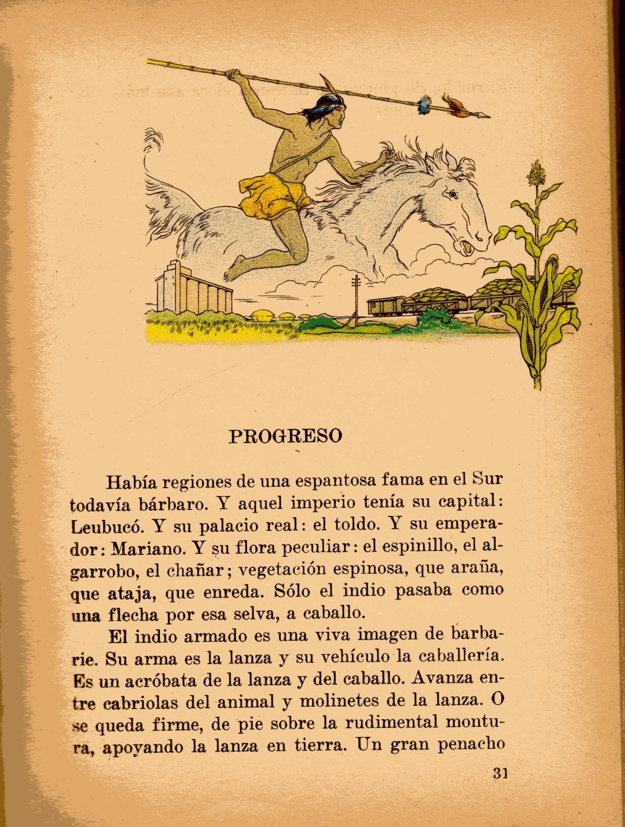 Esto es lo que se observa en un libro escolar del ciclo primario de 1942 donde para hablar del progreso nacional se mencionaba “el pasado extinto de los indígenas azotando las pampas”: