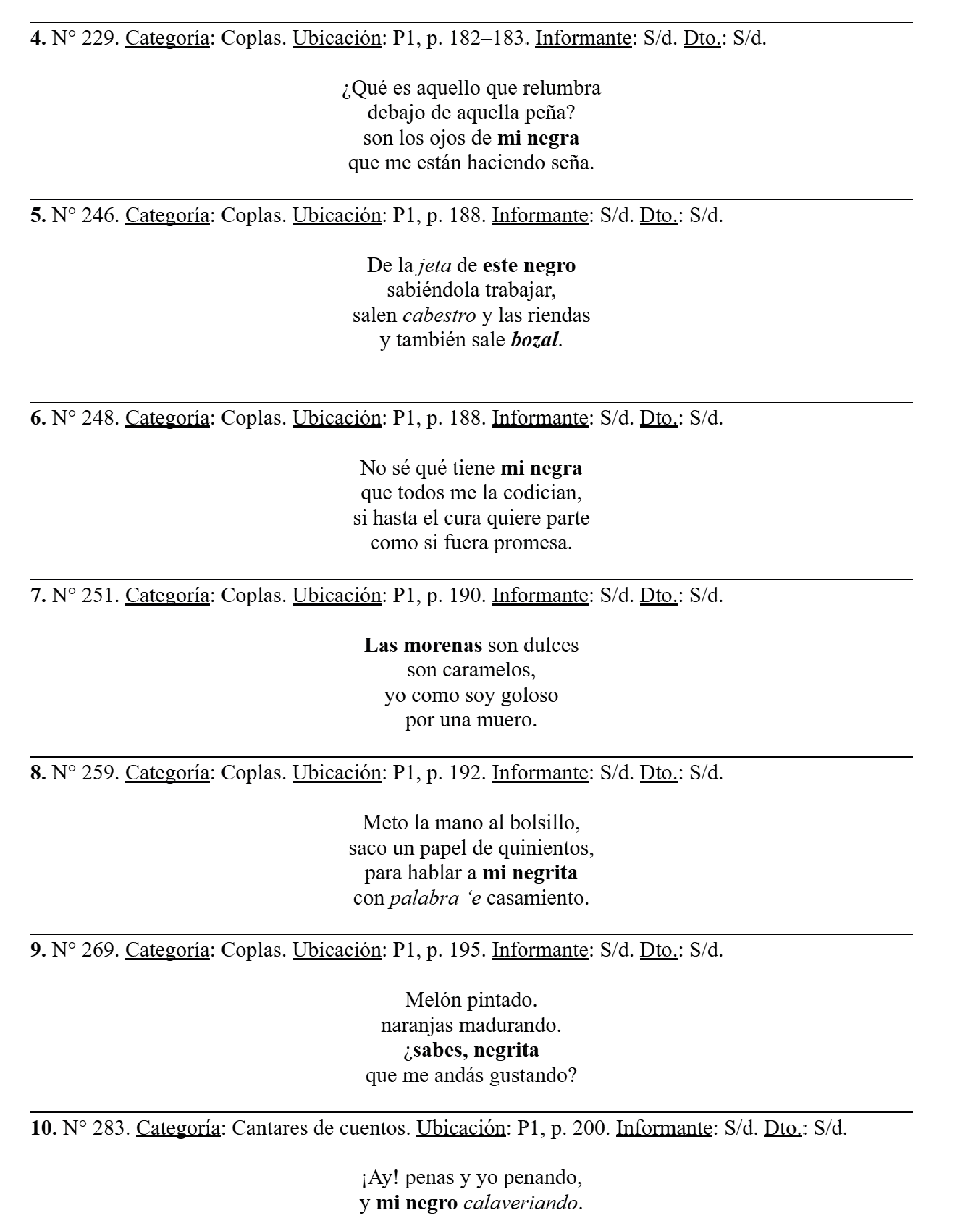 Los ítems 15 y 16 son coplas y referencian a una morena y mi negra, respectivamente, en plano amatorio.