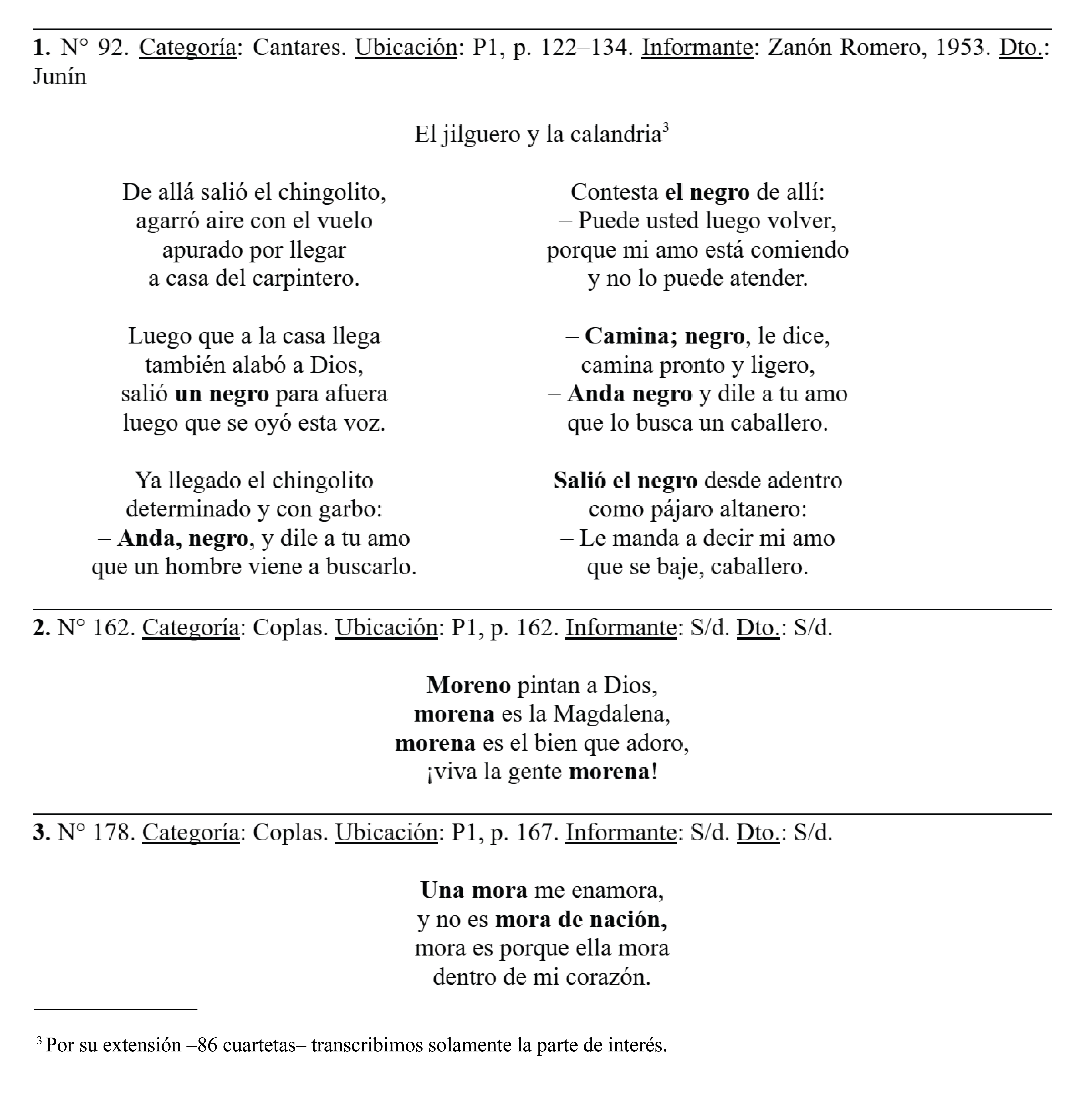 El ítem 1 tiene de modo neutral a un «negro» como personaje principal. Es valioso porque se diferencia de otras versiones que trocan negro por siervo o tordo o suprimen esta parte, como las que están en los cancioneros de Cuyo (Draghi Lucero, 1938 p. 575) y de Santiago del Estero (Di Lullo, 1940 p. 98).