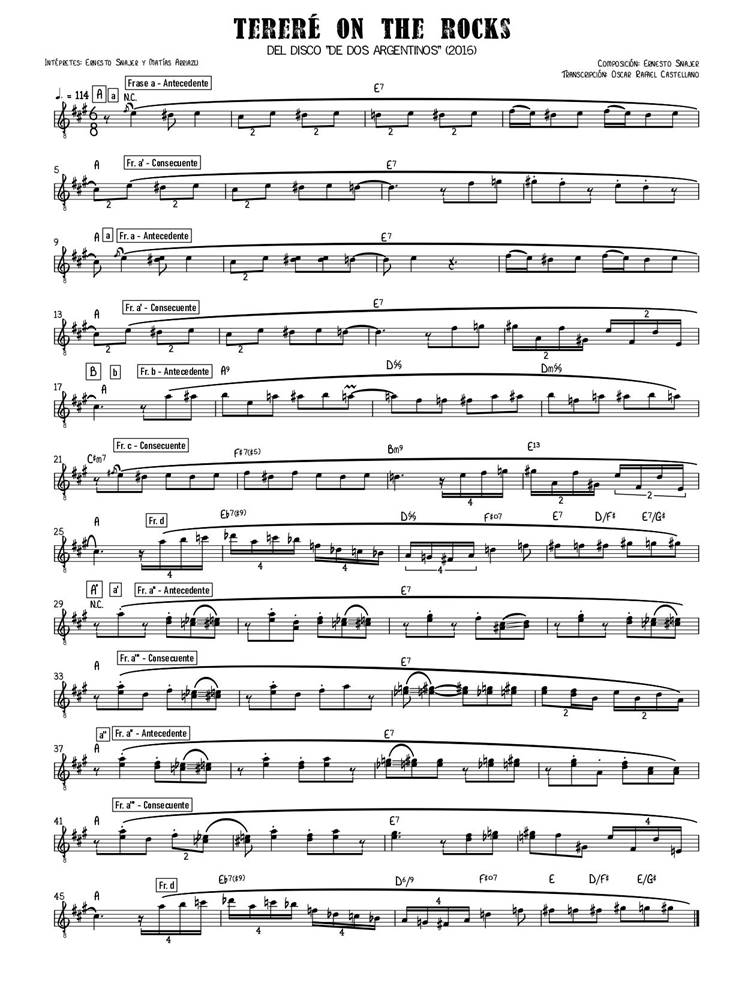 La pieza «Tereré on the rocks» fue publicada por primera vez en el disco Bom Zapar del año 2008, pero nosotros tomaremos una adaptación a dos guitarras grabada en De Dos Argentinos, de 2016, junto a Matías Arriazu en guitarra de 8 cuerdas. En esta composición en particular y en la gran mayoría de sus canciones, en general podemos detectar un sonido argentino que combina, según la propia biografía de Snajer en su sitio web, «jazz, tango, folclore sudamericano y rock» (Snajer, 2016).[1] Respecto de esto, en su canal de la plataforma de videos online YouTube[2] podemos encontrar dos videos del año 2013, cuando el dúo Snajer—Arriazu comenzaba a dar sus primeros pasos. En ellos los músicos declaran: