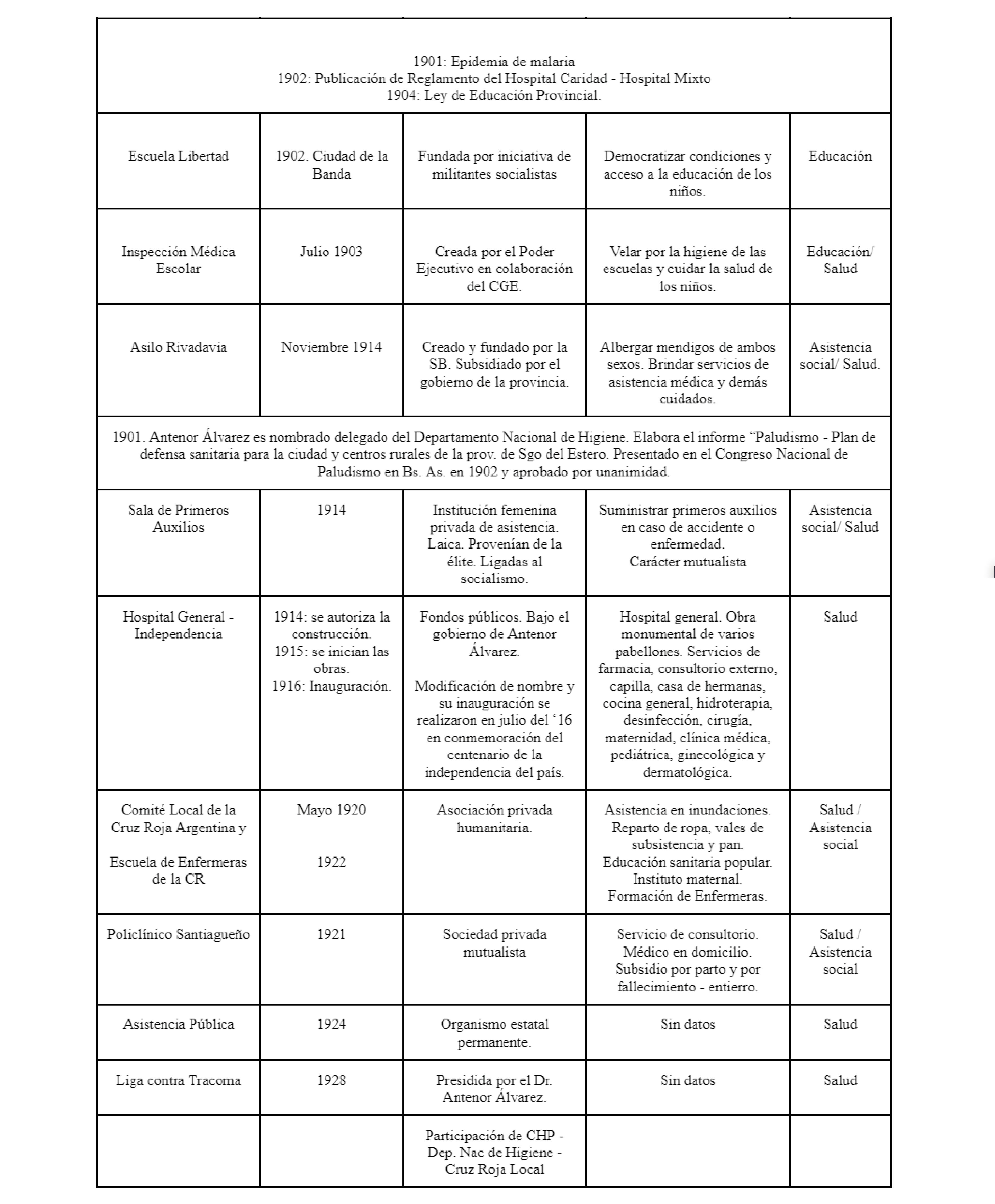 Las primeras dos décadas de 1900 resultan muy prolíficas en términos de creación de instituciones, hospitales, asociaciones y demás bajo iniciativa estatal. Asimismo, se observa que ciertas demandas eran asumidas y respondidas a través de privados o colectivos políticos que irrumpieron en la escena pública. La necesidad de contar con fuerza de trabajo en condiciones para su inserción en el mercado laboral, en el marco de una industrialización azucarera y forestal incipiente resulta arista explicativa.