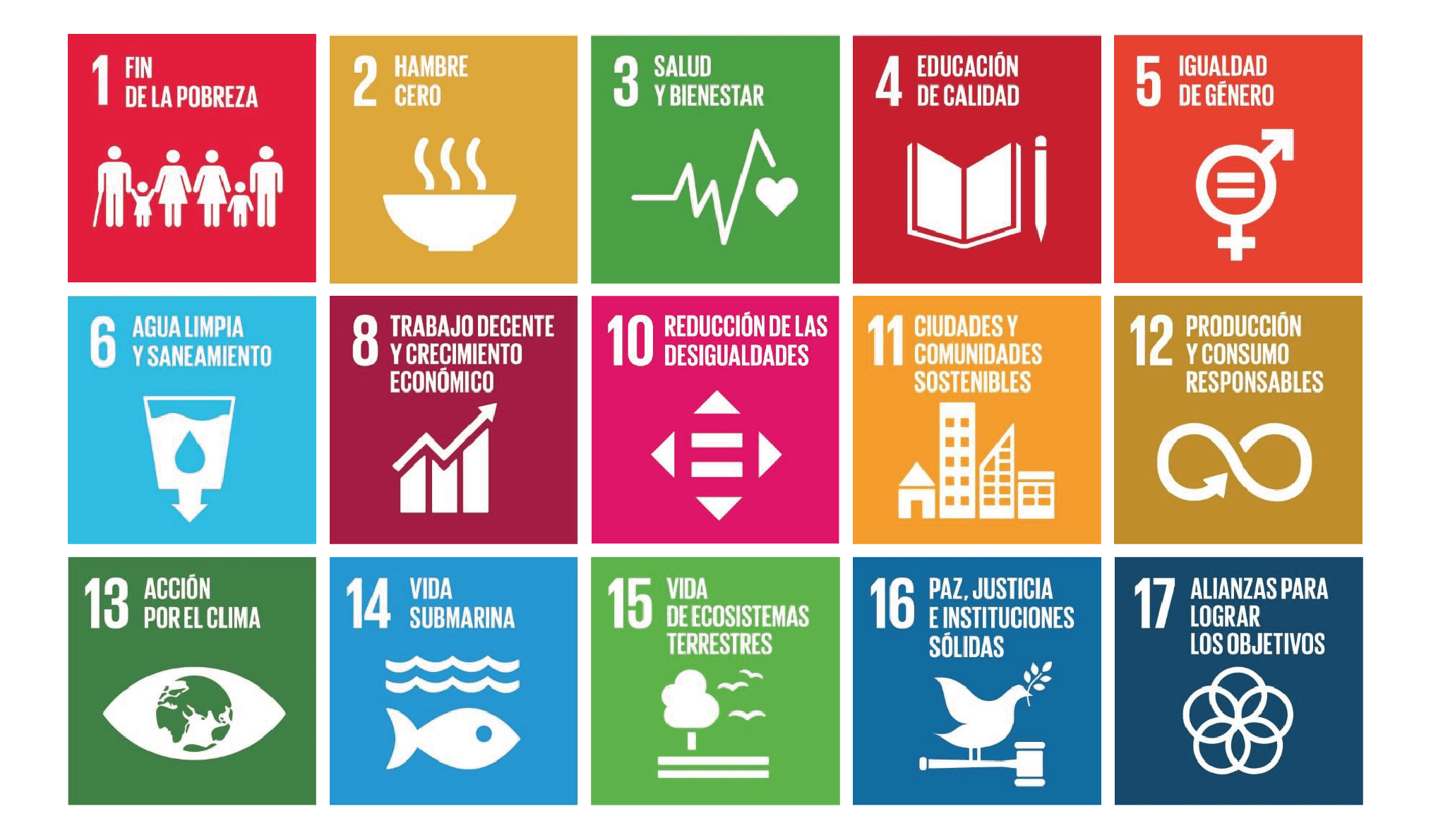 Fin de la pobreza (1); hambre cero (2); salud y bienestar (3); educación de calidad (4); igualdad de género (5); agua limpia y saneamiento (6); trabajo decente y crecimiento económico (8); reducción de las desigualdades (10); ciudades y comunidades sostenibles (11); producción y consumo responsable (12); acción por el clima (13); vida submarina (14); vida de ecosistemas terrestres (15); paz, justicia e instituciones sólidas (16); alianzas para alcanzar los objetivos (17).