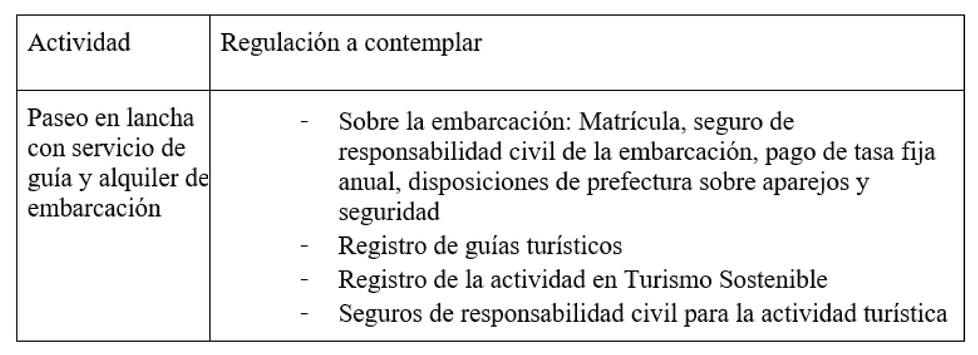 Así, además de la normativa mencionada, es necesario advertir que otras regulaciones provinciales o de carácter administrativo atraviesan la realización de actividades que se encuadran en el ecoturismo. Normas emanadas de la Prefectura Naval Argentina relativas a la navegación o de la administración fiscal o registros notariales en relación a la propiedad de bienes muebles (como las embarcaciones) atañen a la realización de diversas actividades que pueden ser encuadradas como ecoturismo. A modo ilustrativo, se presenta la tabla Nº 1, que procura dar cuenta de la intersección y abundancia normativa en una actividad particular.